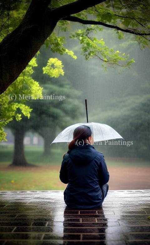 lady sitting with umbrella on a rainy day