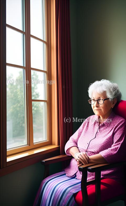 old woman looking at the window at aged care