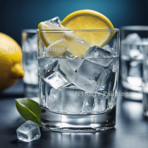 clear glass of wayer with ice cubes and lemon