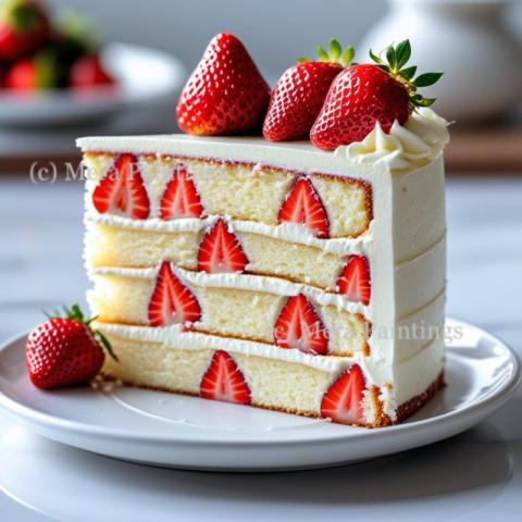 Front view of a cake slice with cream and strawberries